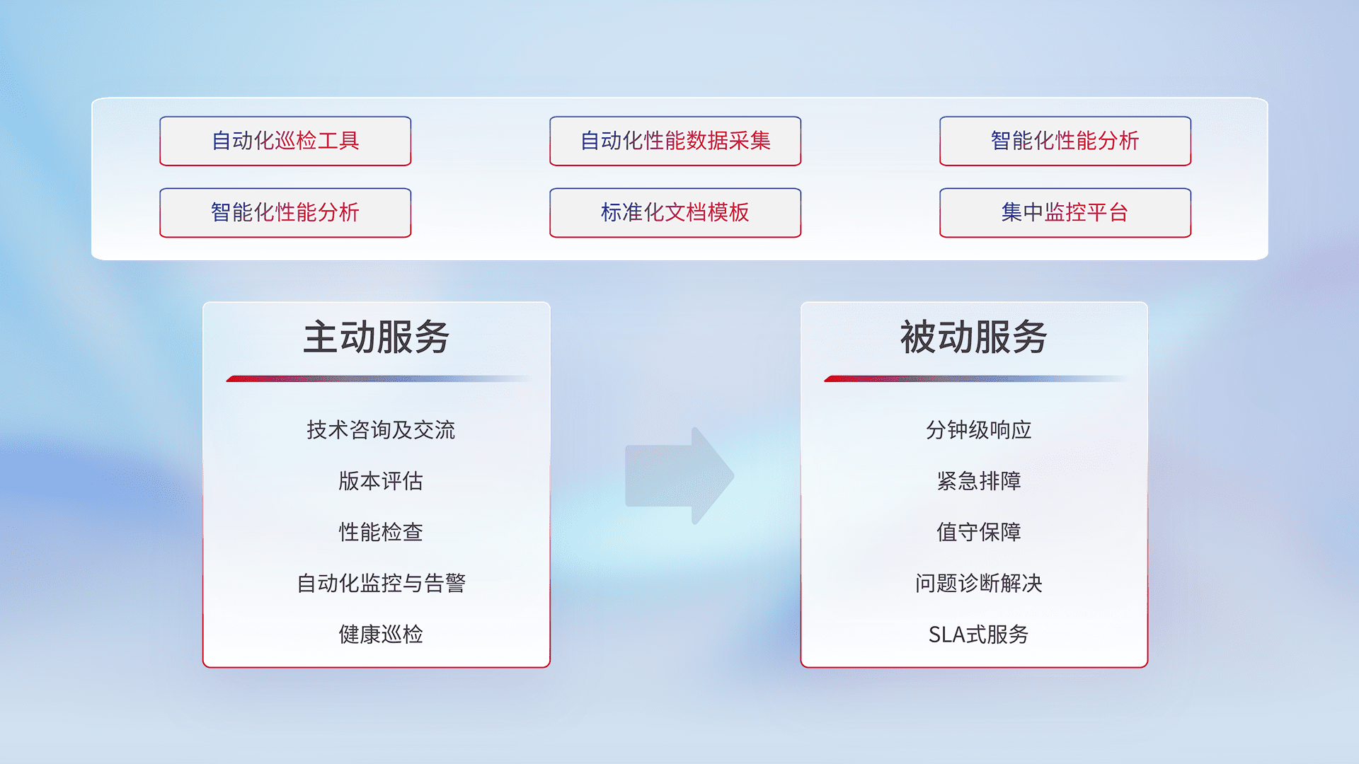 智能化工具和标准化文档,,,,保障服务质量,,,,提供主动服务(包含技术咨询、、版本评估、、、性能检查、、、、自动化监控与告警、、健康巡检)和被动服务包含(分钟级响应、、紧急排障、、、值守保障、、、问题诊断解决、、、SLA服务)。。