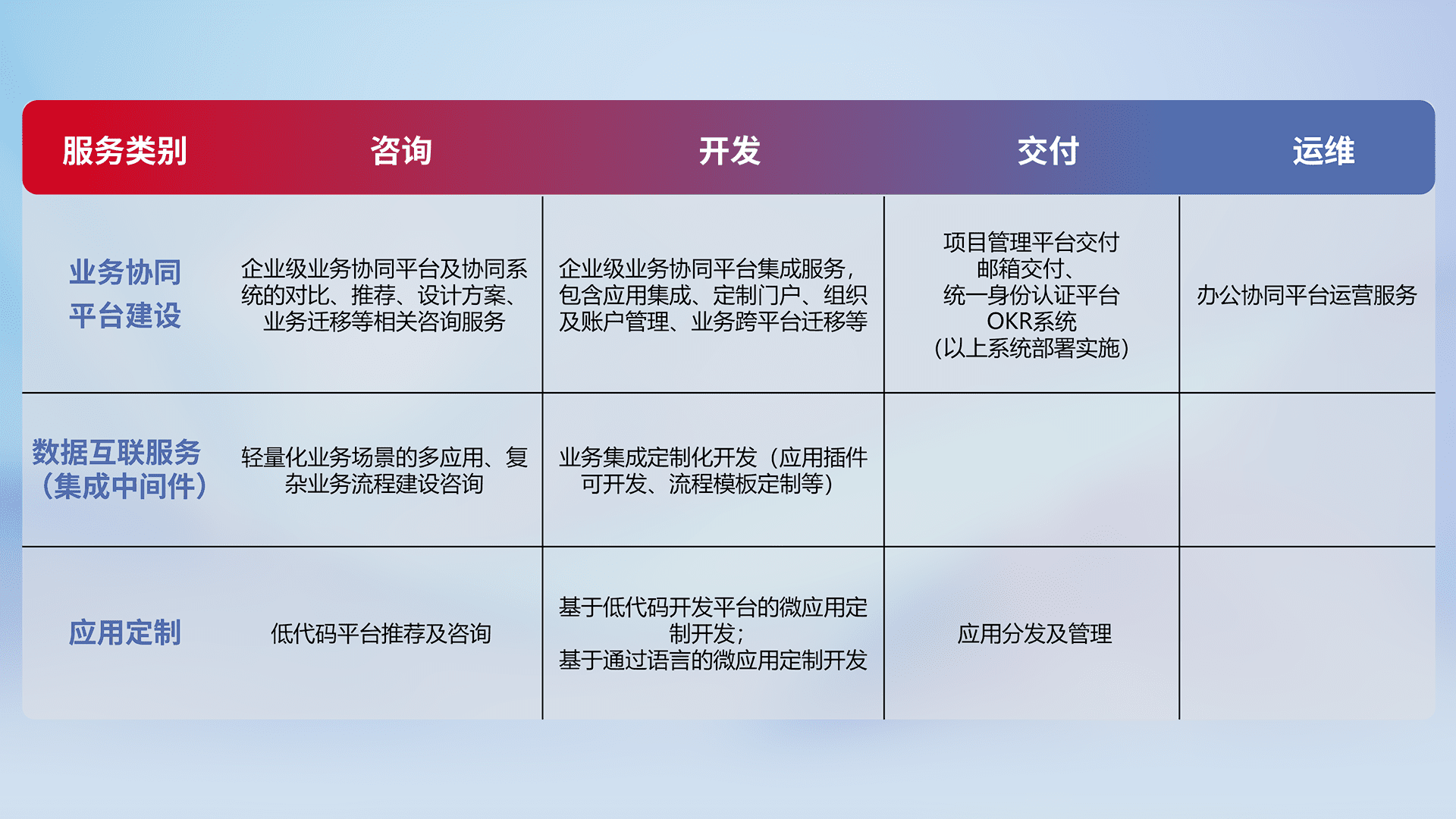针对钉钉、、企微、、、IDaas等平台级产品提供产品的规划、、方案、、、交付、、定制化开发等服务,,实现如统一协同办公、、、、智能客户服务、、混合会议管理、、智能数据查询、、等业务场景,,实现数字化转型。。。